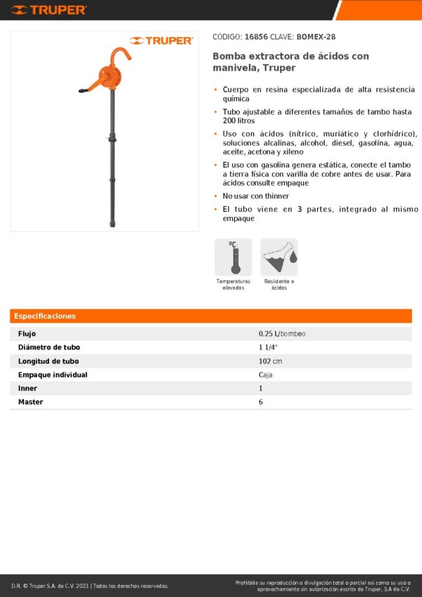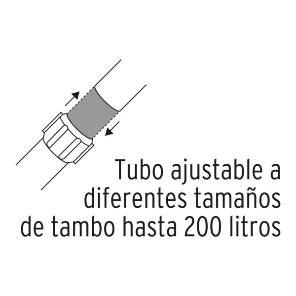 Ficha tecnica bomba 16856 Bomba para extraer líquidos de tambores con un tubo de 102 centímetros ajustable  a diferentes tamaño de tambor de hasta 200 Litros.  Esta bomba está diseñada para la resistencia a ácidos, alcoholes, combustibles y líquidos a altas temperaturas.