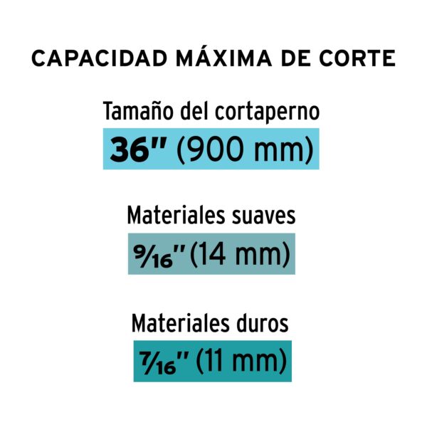 12835 CP-36X 36″ (91 cm) Materiales suaves 9/16″ (14.2 mm), materiales duros 7/16″ (11 mm)  Largo zona de corte  1 17/32″ (39 mm)